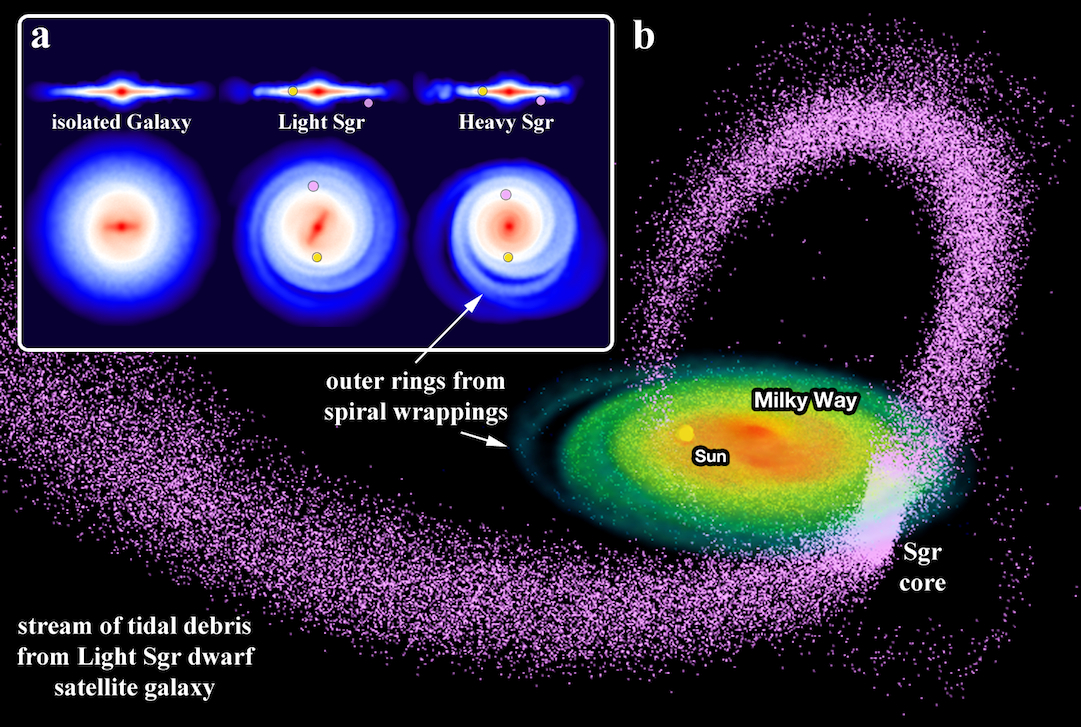 The results were surprising, even to the coauthors. “The Sagittarius Dwarf impact triggered spiral arms in the Milky Way,” concluded Purcell, who is now a postdoctoral research associate at the University of Pittsburgh. The supercomputer simulations revealed that far more important in the collision than the Sagittarius Dwarf’s stars were its dark matter halo, which was itself about equal in mass to all the stars in the Milky Way. “When all that dark matter smacked into the Milky Way, 80 to 90 percent of it was stripped off,” Purcell explained. “But the whirling disk of stars that was the Milky Way at this time was a very tenuous, chaotic system. That first impact produced instabilities that were amplified and quickly formed spiral arms and associated ring-like structures in the outskirts of our Galaxy.”